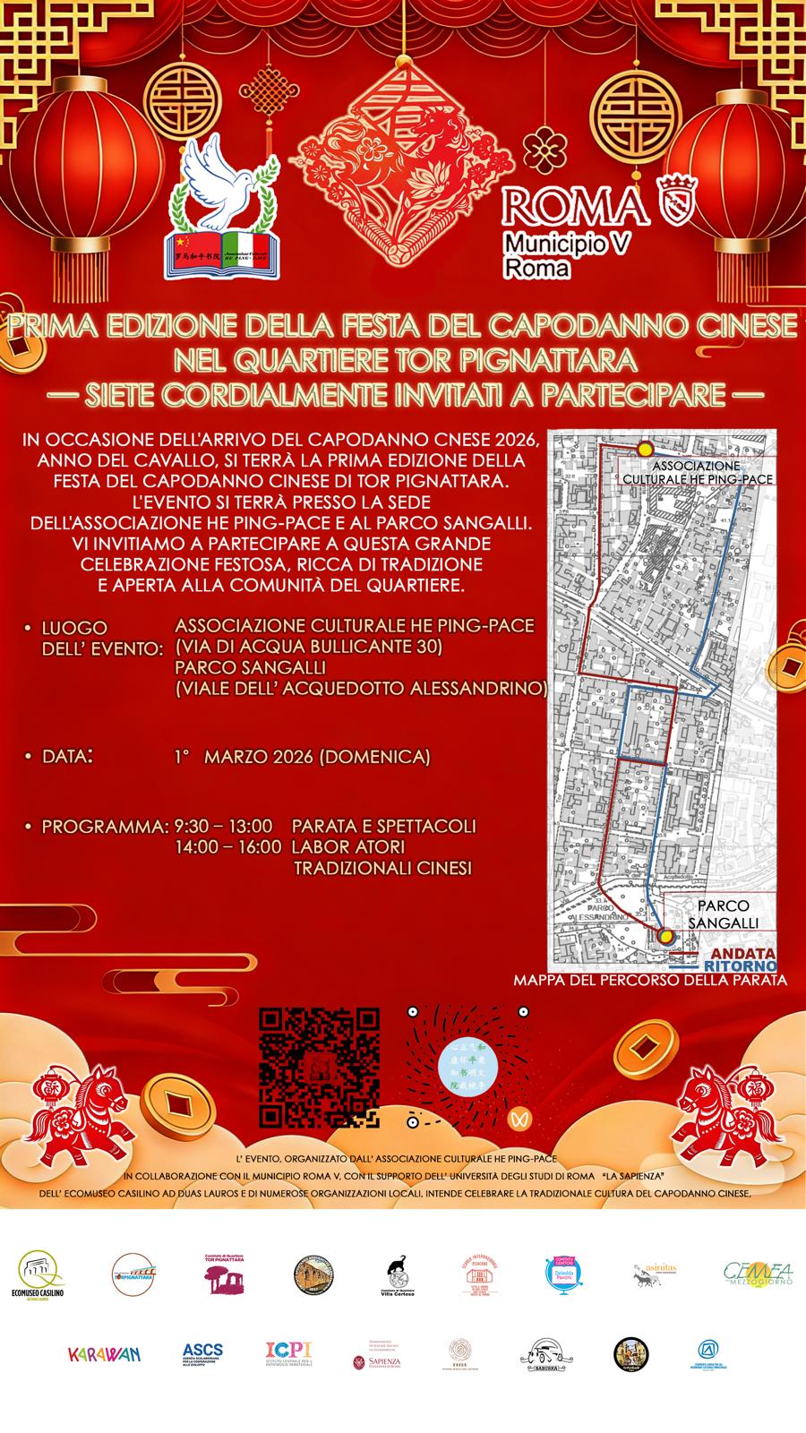 On March 1, 2026, from 9:30 a.m. to 4:00 p.m., the neighborhood of Tor Pignattara in Municipio Roma V (Rome) will host the first edition of the “Chinese New Year of Tor Pignattara”, a community-led intercultural event that reinterprets the Chinese New Year as a shared urban heritage and a tool for social cohesion.Recognized by UNESCO as Intangible Cultural Heritage of Humanity, the Chinese New Year is here presented not only as a festive celebration, but as a living cultural practice embedded in everyday urban life, capable of fostering dialogue, inclusion, and collective belonging within one of Rome’s most historically multicultural areas.A community-based intercultural paradeThe event takes the form of a participatory parade starting from the historic Carlo Pisacane school complex and moving through the streets of Tor Pignattara. It is conceived and coordinated by Xiaoyan Zhou, Director of the HE PING – PACE Association, with the active involvement of local schools, associations, residents, and cultural act