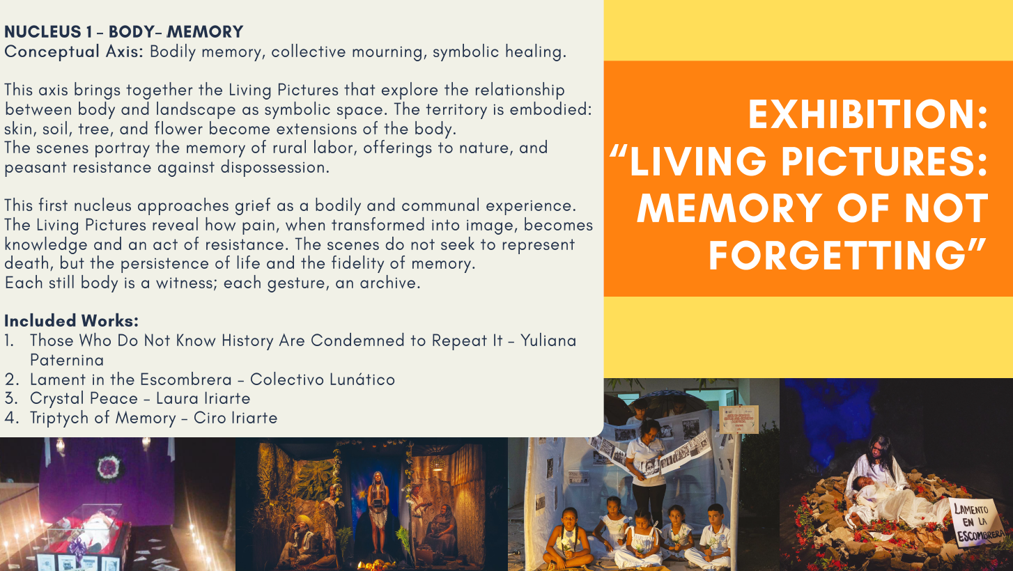 Cuadros Vivos (Living Pictures): Memory of Not Forgetting is a long-term, community-based safeguarding system of intangible cultural heritage, developed continuously since 2016 in Galeras, Sucre (Colombia). It emerges from a sustained territorial research–creation process rooted in embodied memory, oral transmission, ritual practices, collective creation, and intergenerational knowledge systems, where heritage is lived, enacted, and transmitted through daily community life rather than institutional extraction.